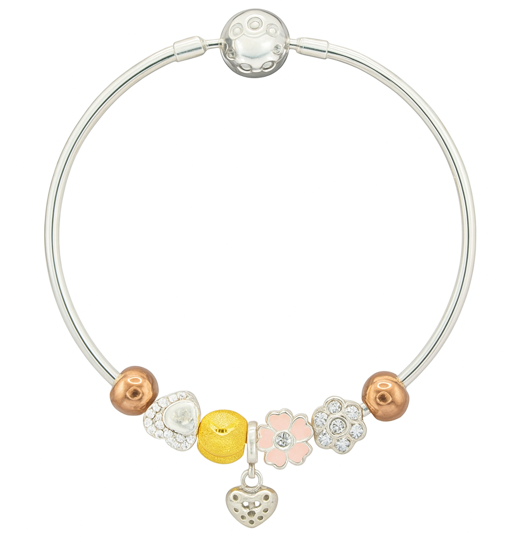Celebrate gentle beauty and heartfelt connections with PetalHeart, a graceful charm bangle designed to capture love in bloom. This silver bracelet features a soft palette of blush pink and crystal-clear florals, balanced by a touch of radiant gold and shimmering heart charms. The centerpiece—a dangling silver heart charm—adds a romantic, personal touch, making this piece perfect for expressing affection or marking a cherished memory.