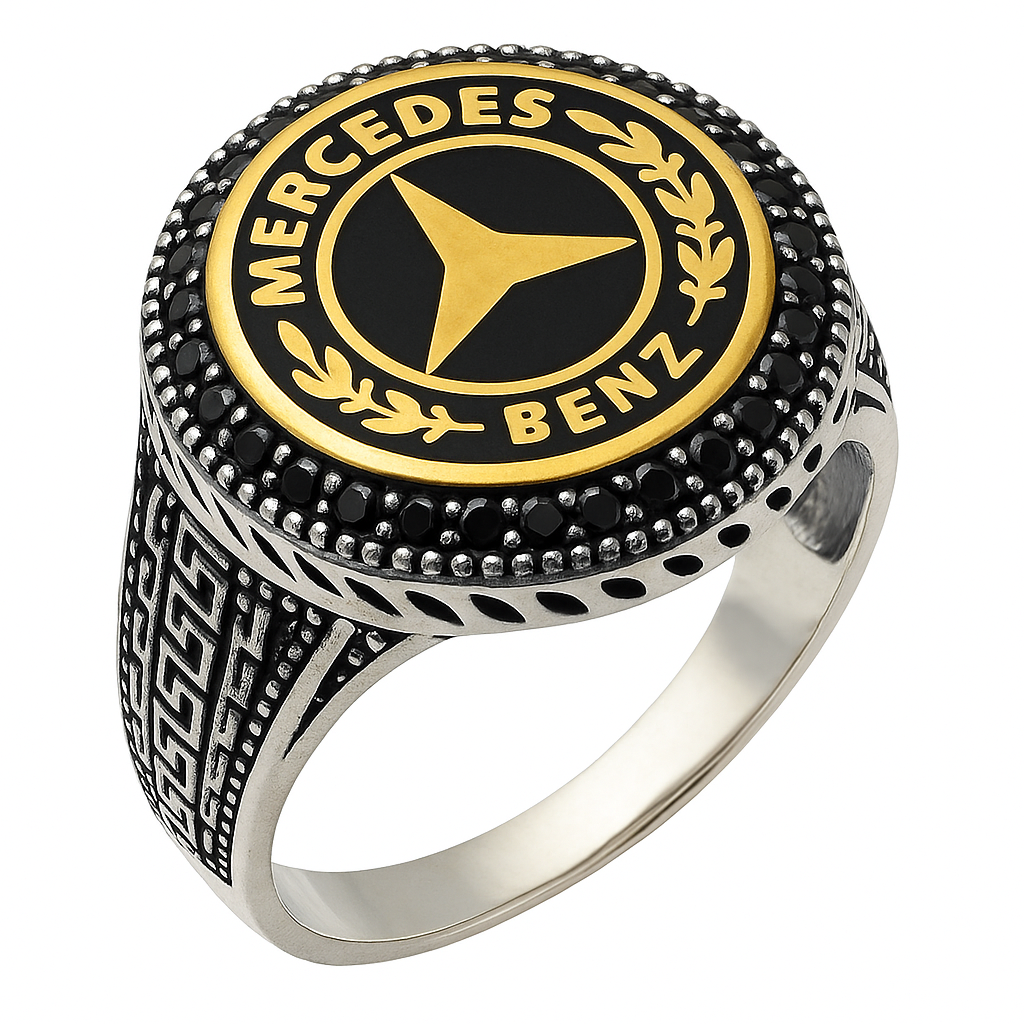 The Powerline Crest ring features a bold, circular emblem highlighted in black and gold, showcasing the iconic Mercedes Benz logo. Surrounded by dark stones and detailed geometric patterns along the band, this silver ring combines strength, elegance, and timeless automotive style. Perfect for those who appreciate refined design with a powerful edge.