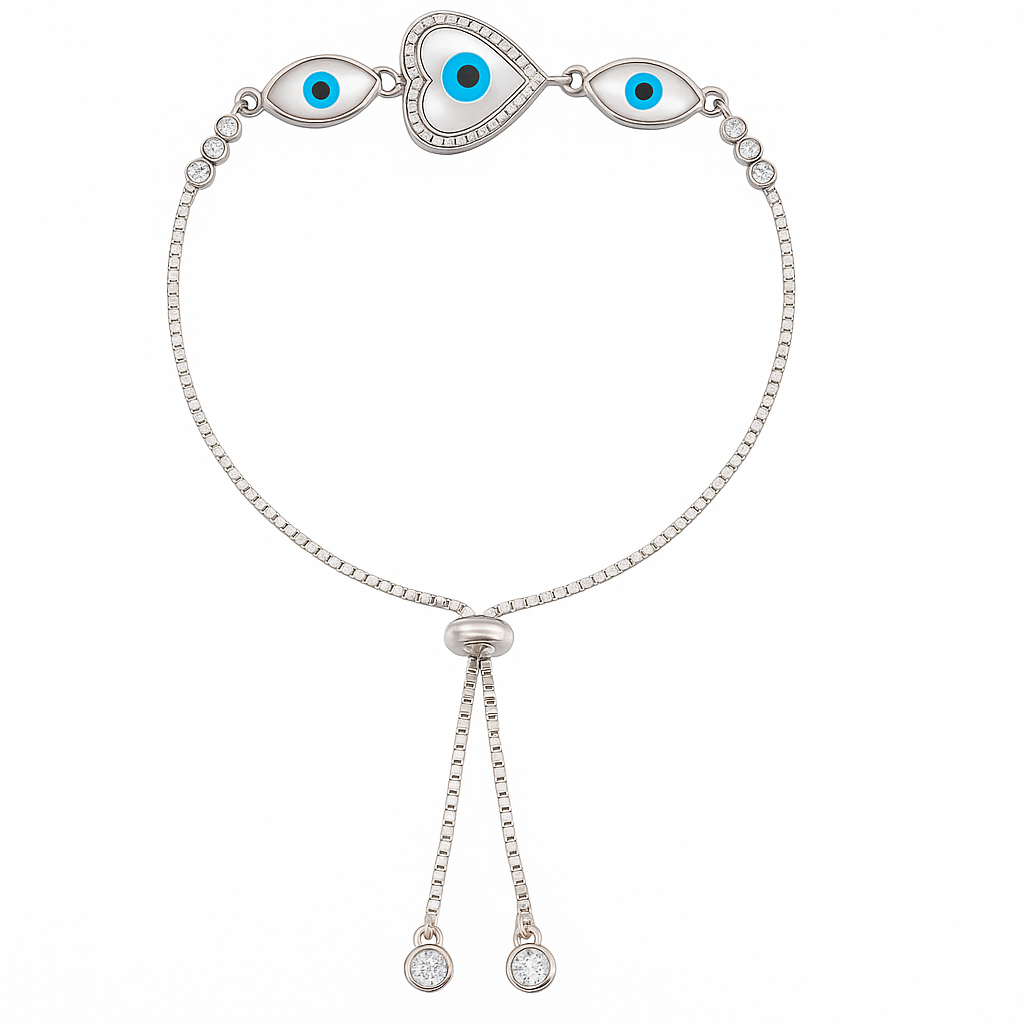 This elegant adjustable silver bracelet features a unique trio of charms – two protective evil eye motifs framing a radiant heart centerpiece adorned with fine, sparkling stones. The heart is set with a signature turquoise dot, symbolizing protection and love. The delicate box chain and sliding clasp ensure a perfect fit, making it both stylish and meaningful for everyday wear.