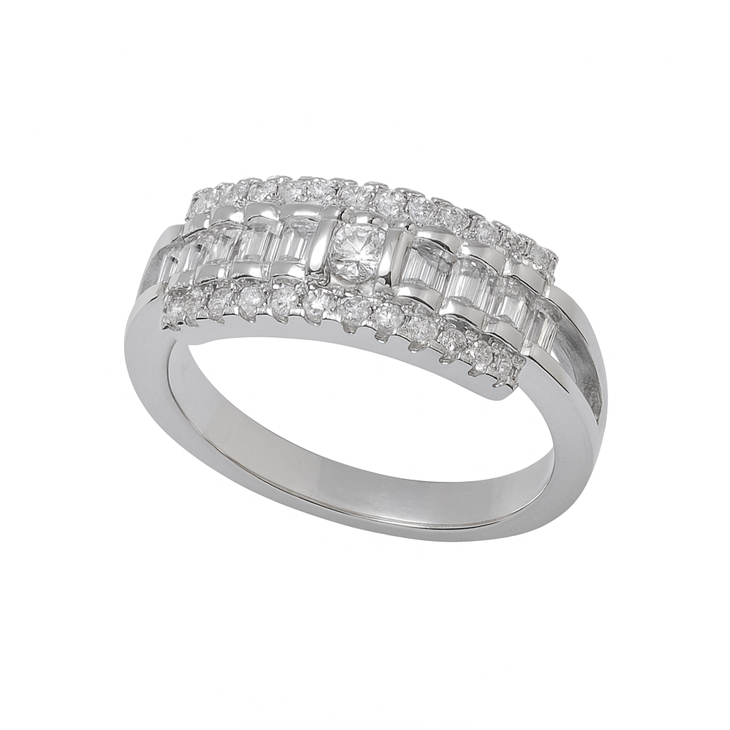 This striking sterling silver ring features three shimmering rows of precision-set stones. The center row showcases a sleek line of baguette-cut stones, flanked by two rows of brilliant round sparkling stones for maximum sparkle. Bold yet refined, this ring is a perfect blend of structure and shine—ideal for adding sophistication to any look.