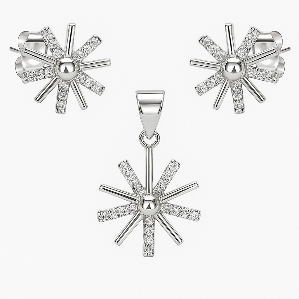 Inspired by starlight, the Rays features a radiant pendant and matching stud earrings, crafted in high-polish sterling silver. Each piece showcases a unique 10-ray starburst design with an artistic mix of sleek silver arms and shimmering cubic zirconia-encrusted lines. This bold yet elegant arrangement captures light beautifully, making it a perfect statement for festive occasions or everyday brilliance.