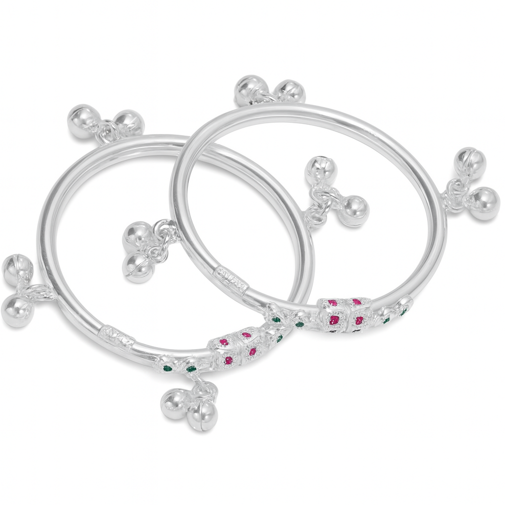 Elevate your little one's style with our Regal Charm Kangans, crafted from premium sterling silver and adorned with intricate red and green stonework. These traditional kangans feature charming silver ghungroos that create a delicate jingle, adding both grace and heritage to every step. Perfect for festive occasions or cherished everyday wear, these bangles blend classic craftsmanship with timeless elegance.