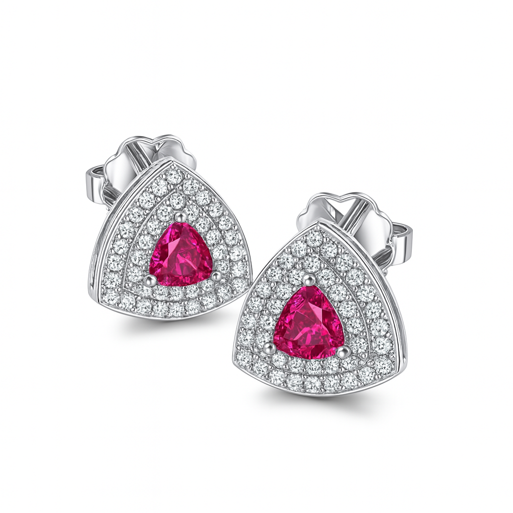 The Rosé Prism Studs feature a striking triangular design centered around a vivid pink gemstone, surrounded by two rows of brilliant white stones. Set in polished silver, these earrings reflect light from every angle, combining geometric elegance with feminine charm. A perfect balance of sparkle and sophistication for both everyday wear and special occasions.