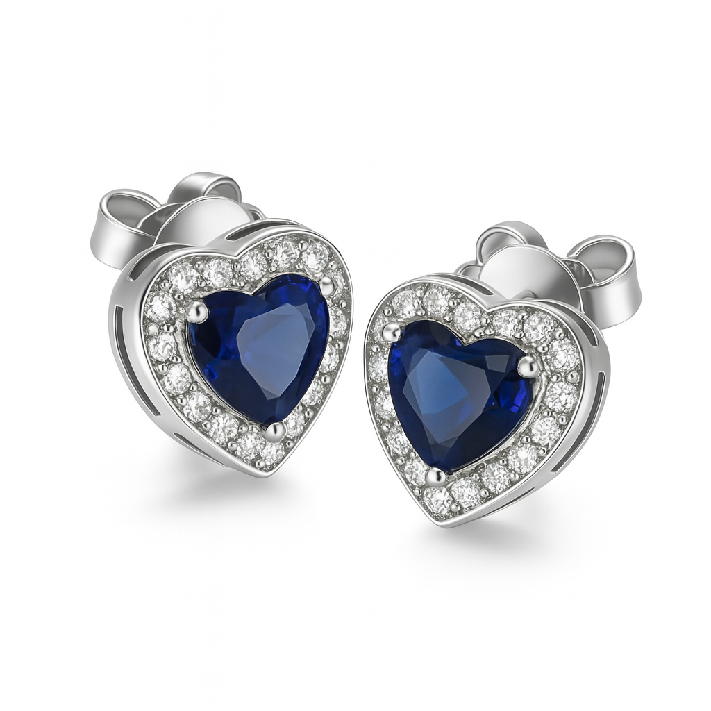 The Royal Blue Hearts feature deep blue, heart-shaped gemstones cradled in polished silver and framed by a radiant halo of sparkling white stones. With their elegant tilt and romantic silhouette, these studs bring a timeless charm and a touch of midnight magic to every look.