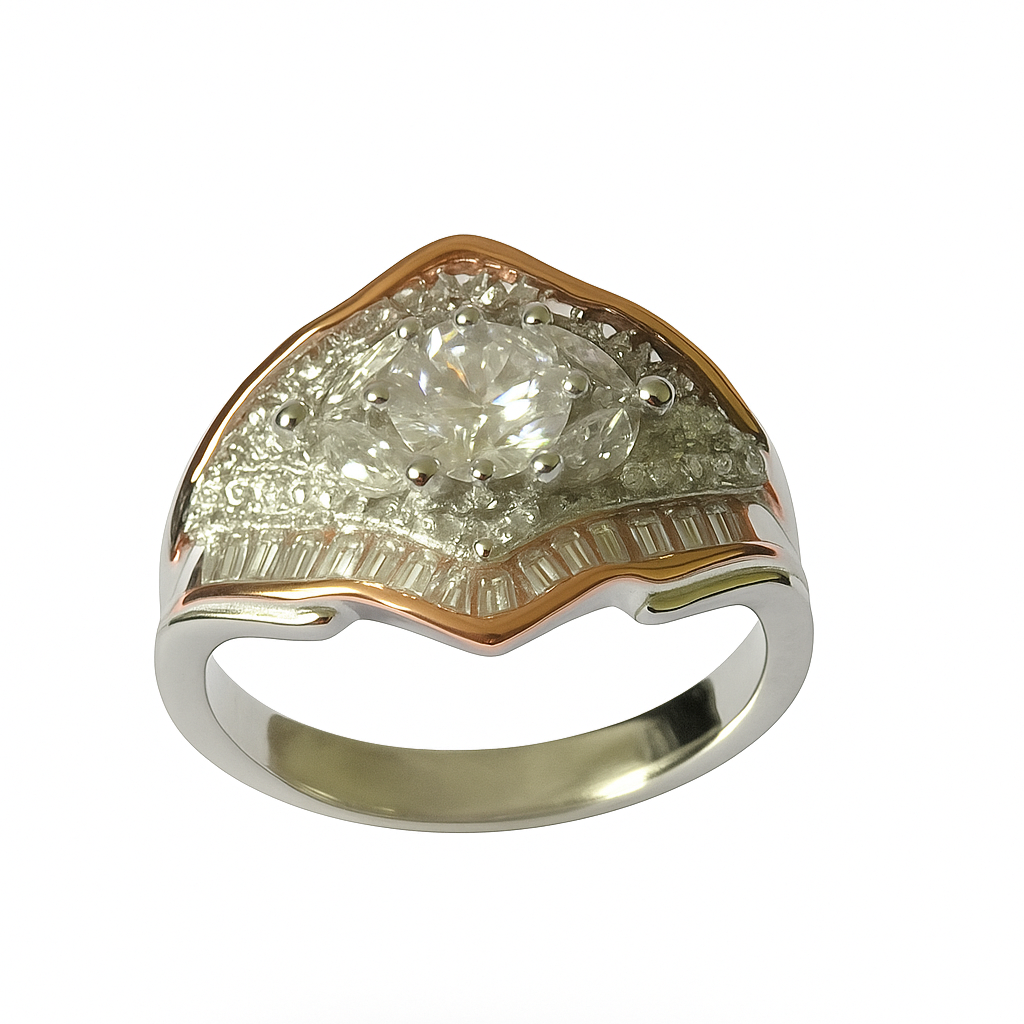 The Royal Crest ring is a majestic blend of elegance and power, crowned with a brilliant-cut center stone and framed by a cascade of baguette and round diamonds. Its sweeping arch design and two-tone detailing evoke the grace of a royal emblem. A perfect statement piece for those who love commanding beauty with timeless sophistication.