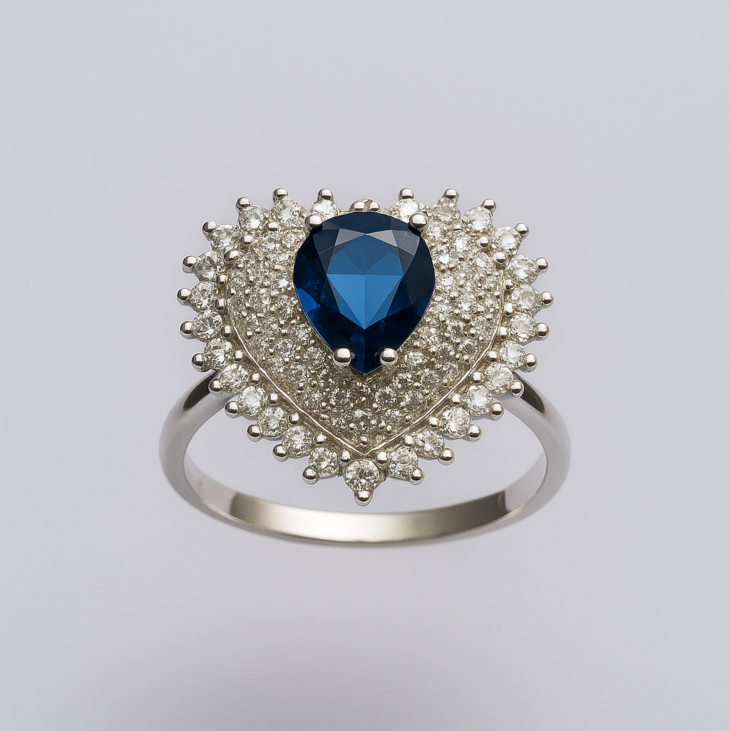 The Royal Heart ring features a bold, deep blue pear-shaped stone set in the center of a heart-shaped design. Surrounded by a sparkling border of clear stones on a shiny silver band, this ring blends elegance with a touch of royalty. It’s a beautiful piece that stands out and adds charm to any outfit.