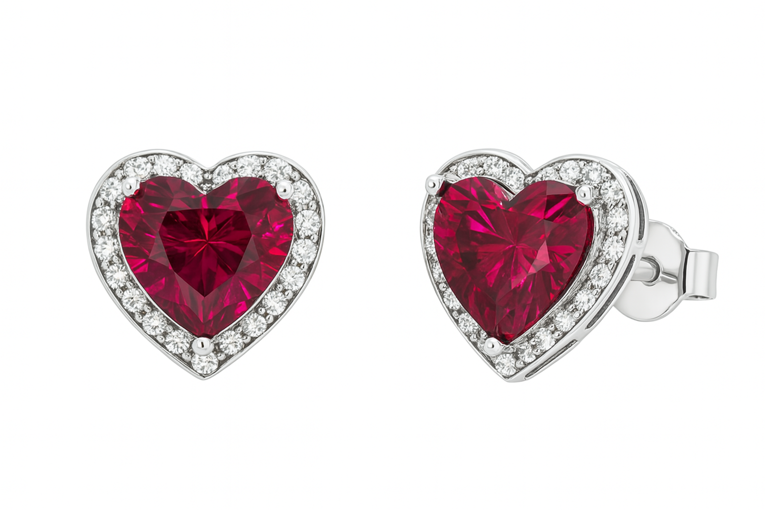 The Royal Rosy Hearts earrings feature heart-shaped studs adorned with deep rosy pink gemstones at their center, cradled by a halo of brilliant white stones. Set in polished silver and secured with butterfly backs, these angled beauties symbolize warmth, affection, and timeless grace — perfect for elevating any elegant ensemble.
