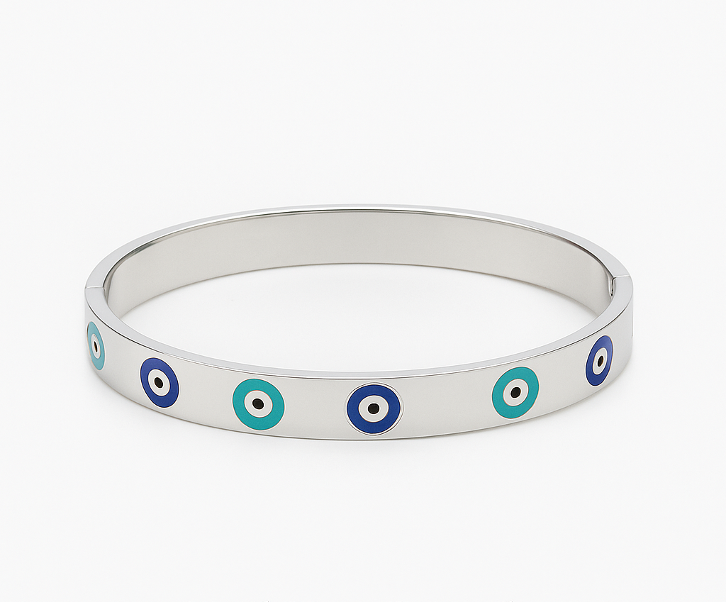 A sleek and polished sterling silver bangle adorned with a series of multicolored evil eye charms, symbolizing protection and balance. This minimalist design adds a touch of spiritual elegance while keeping the style clean and modern—perfect for everyday wear or as a meaningful gift.