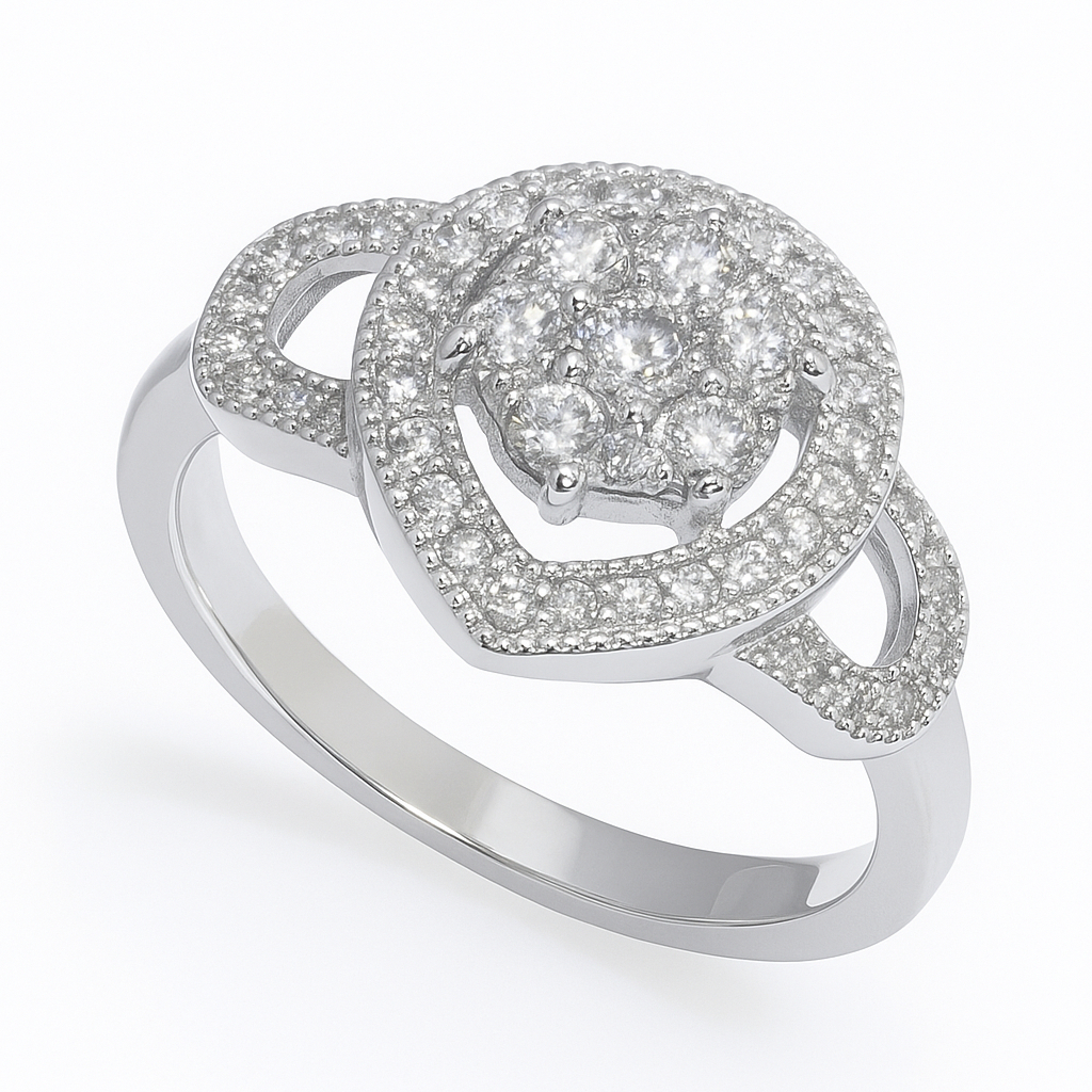 This silver statement ring featuring a sparkling cluster of round-cut stones set in a teardrop-shaped halo. The outer rim is detailed with smaller pavé stones, adding texture and brilliance. The band splits near the top, giving it a graceful, open design that complements the clustered centerpiece.
