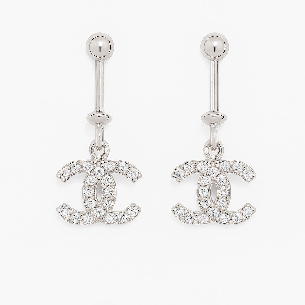 These chic silver earrings feature the iconic double-C design encrusted with shimmering stones. Hanging from polished studs, they offer a perfect blend of elegance and brand-inspired style. Ideal for elevating any outfit with a touch of classic glamour.