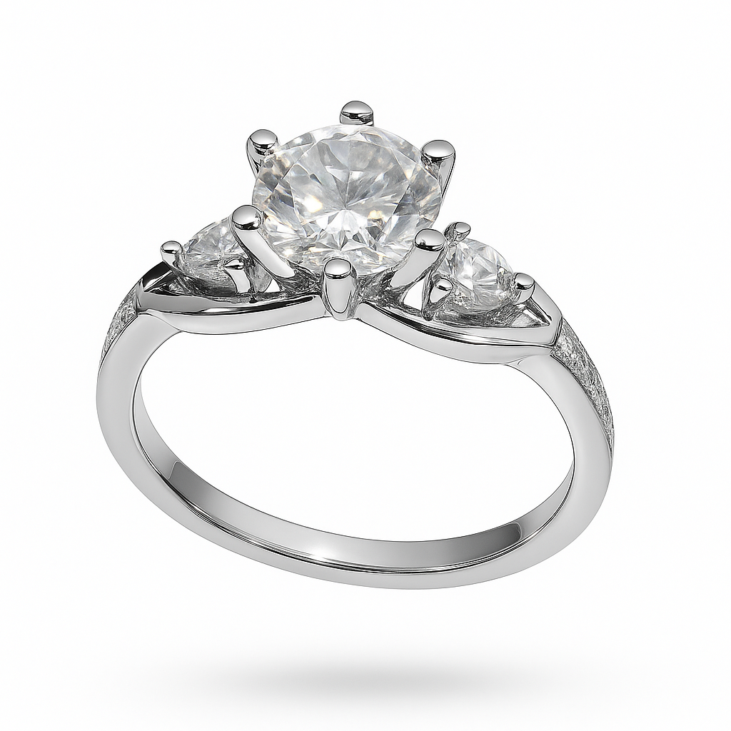 The Silver Bloom ring features a graceful trio of sparkling stones, led by a brilliant center gem held in classic prongs, framed by two smaller accents. The sleek silver band curves gently around the finger, creating a timeless, balanced look. Its design symbolizes clarity, unity, and elegance—perfect for someone who values subtle sophistication.
