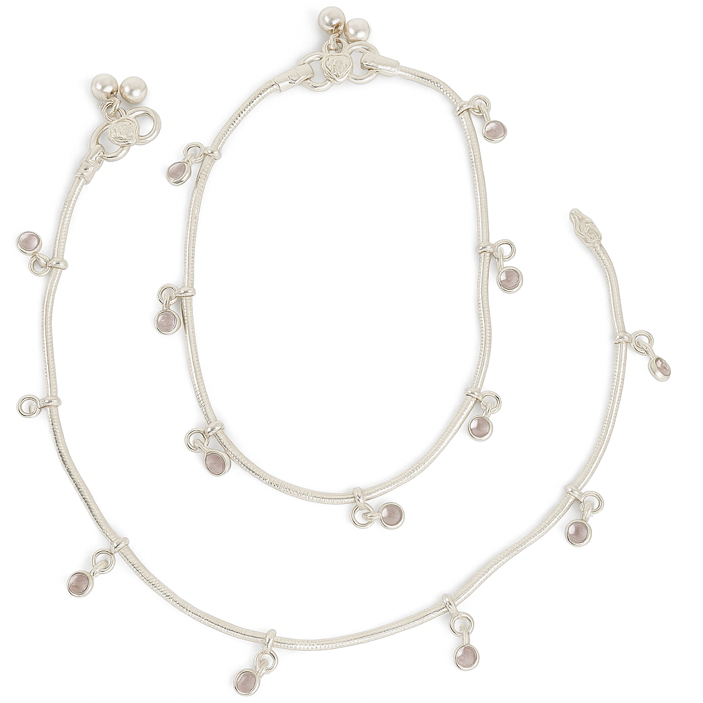 Silver Droplets is a graceful anklet crafted from sleek silver chainwork, accented with soft lavender-toned bead charms that shimmer like dewdrops. Its flowing design and evenly spaced dangles create a gentle movement, adding a touch of elegance and charm to every step.