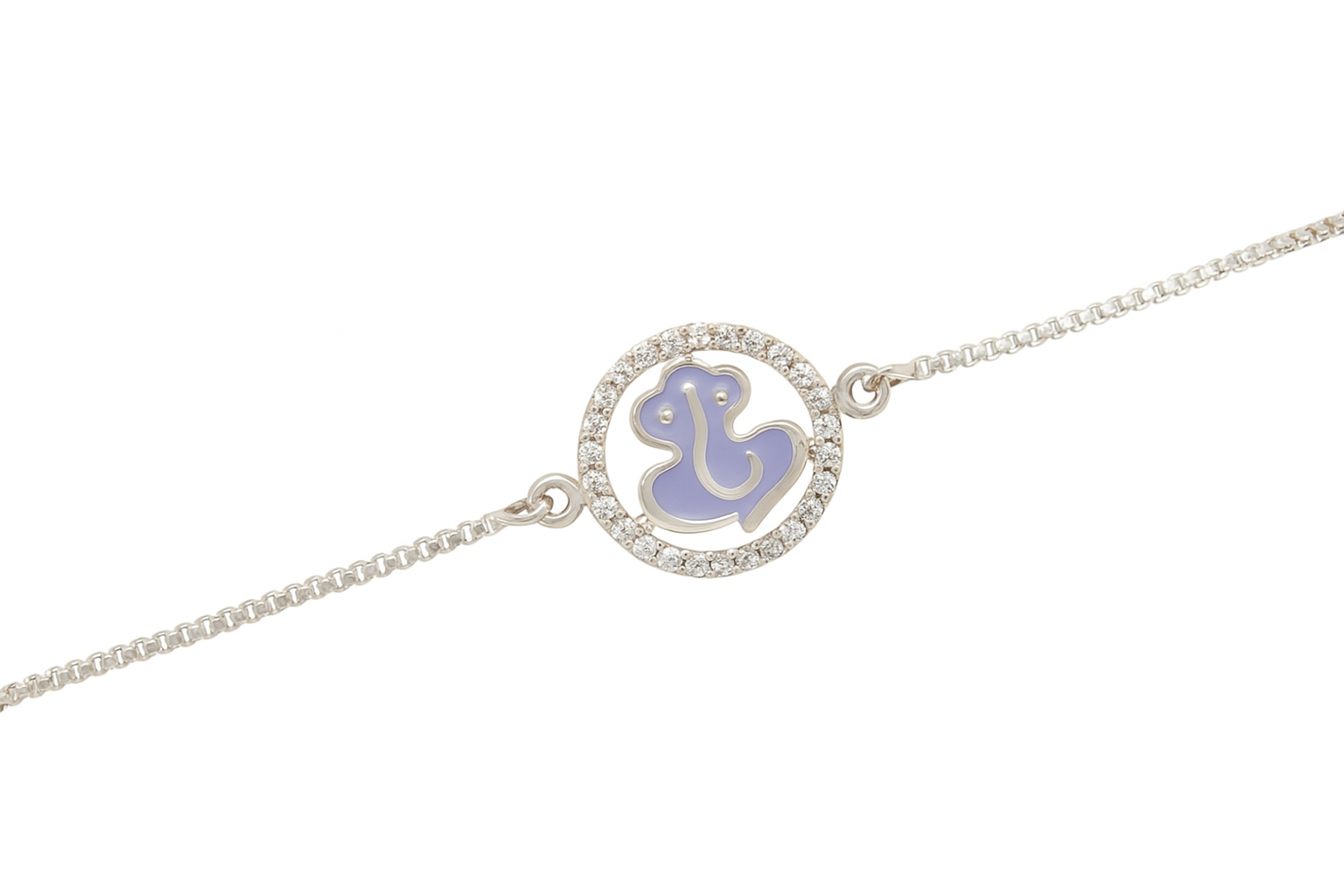 Celebrate the eternal bond of love with this elegant sterling silver Rakhi, featuring a beautifully detailed circular centerpiece adorned with a lavender enamel Lord Ganesha motif. The Ganesha emblem is surrounded by a shimmering halo of miniature clear stones, symbolizing prosperity and protection for your brother. Crafted with a fine silver chain, this rakhi blends tradition with modern design, making it a memorable keepsake long after Raksha Bandhan.