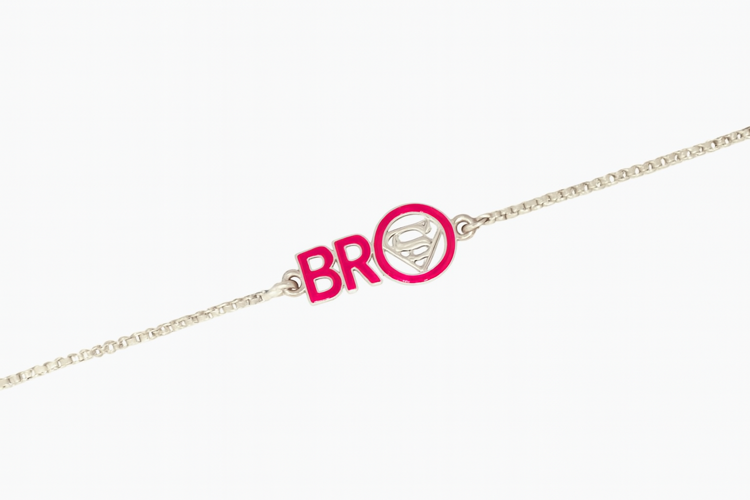 Celebrate the unbreakable bond of siblinghood with this Super Bro Silver Rakhi. Crafted in pure sterling silver, this rakhi features the bold "BRO" lettering in vibrant pink enamel alongside a sleek Superman emblem enclosed in a matching pink circle—symbolizing your brother’s strength, courage, and superpower in your life. The fine silver chain adds elegance, making it a perfect keepsake beyond Raksha Bandhan. Thoughtfully designed for style and sentiment, it’s a modern tribute to your everyday superhero.