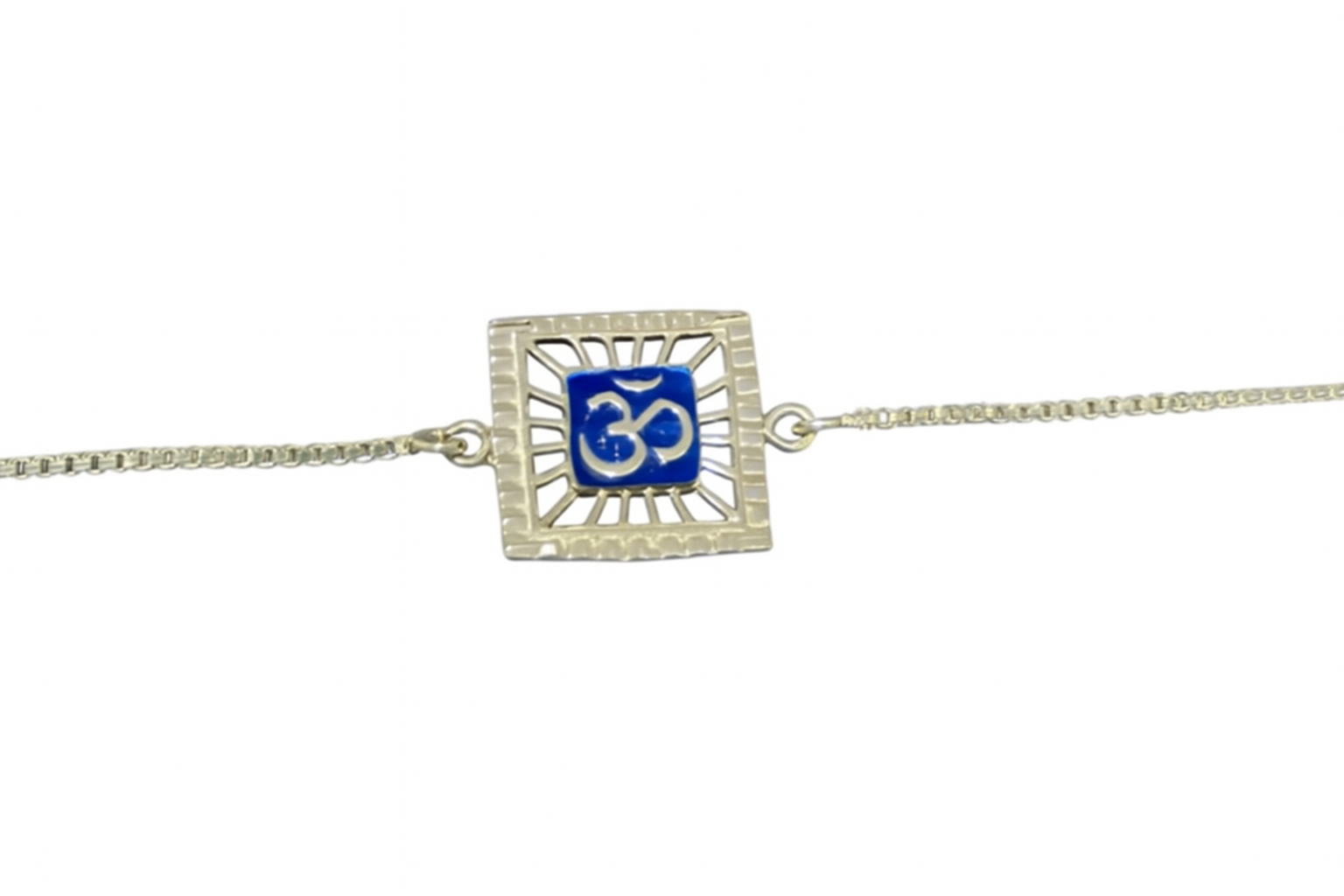Embrace divine elegance with this intricately crafted silver Om bracelet, featuring a radiant blue enamel centerpiece. The bracelet showcases a polished square frame with sunburst-style detailing that highlights the sacred 'ॐ' (Om) symbol at the heart. Symbolizing peace, spirituality, and protection, the Om is beautifully embedded in a royal blue backdrop, lending a bold contrast to the sleek silver