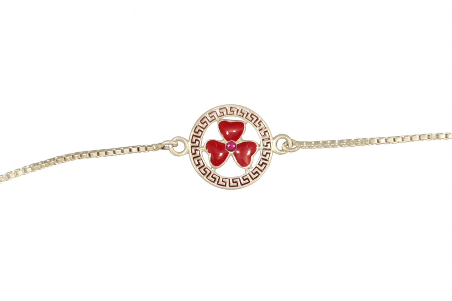 Elevate your accessory game with this eye-catching silver floral rakhi, featuring a radiant red enamel flower encased in a polished circular frame. The centerpiece showcases a three-petal design with a vibrant pink gemstone at the core, symbolizing beauty and energy. Surrounding the flower is a finely detailed Greek key pattern, representing eternity and unity. Crafted with a sleek silver chain and precision-polished finish, this bracelet blends tradition with modern charm — perfect for gifting or daily elegance.