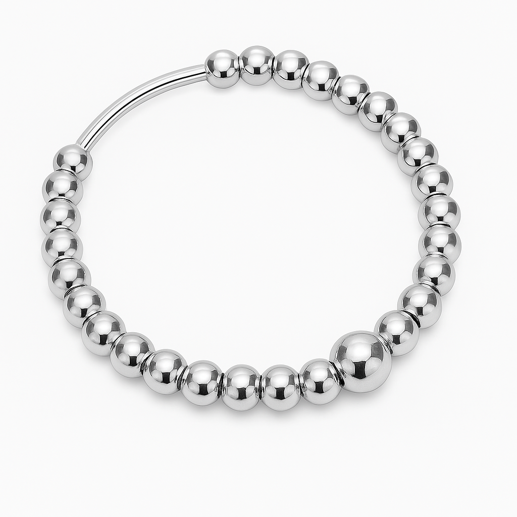 This sleek and modern bracelet features a continuous strand of polished silver beads, perfectly uniform except for a single, larger central bead that adds a bold focal point. The minimalist design and symmetrical arrangement create a harmonious look, making it a versatile accessory for both casual and formal wear.