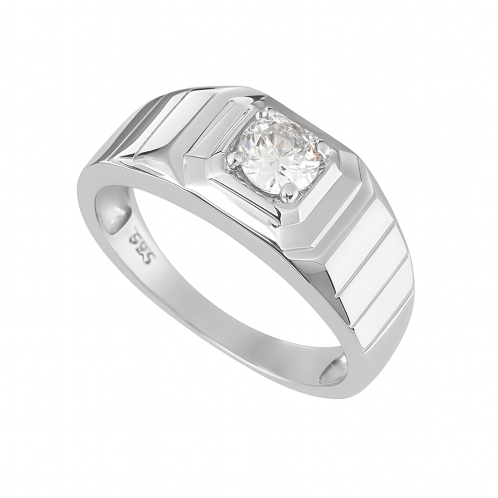 Command attention with the Sovereign Shine Ring, a bold yet elegant statement of power and poise. Crafted from high-polish sterling silver, this ring features a sleek ridged band design crowned with a single dazzling diamond-like stone at the center. Its clean, structured form exudes confidence, making it the perfect choice for modern men who value style.