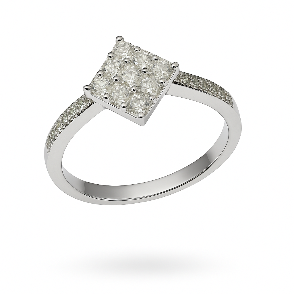 This elegant silver ring features a square-shaped cluster of sparkling stones, giving it a bold yet graceful look. The band is adorned with small shimmering accents on both sides, adding a touch of extra shine. Perfect for special occasions or everyday elegance, it blends classic charm with modern style. Made with high-polish silver and high-quality imitation diamonds, it's a budget-friendly beauty with timeless appeal.