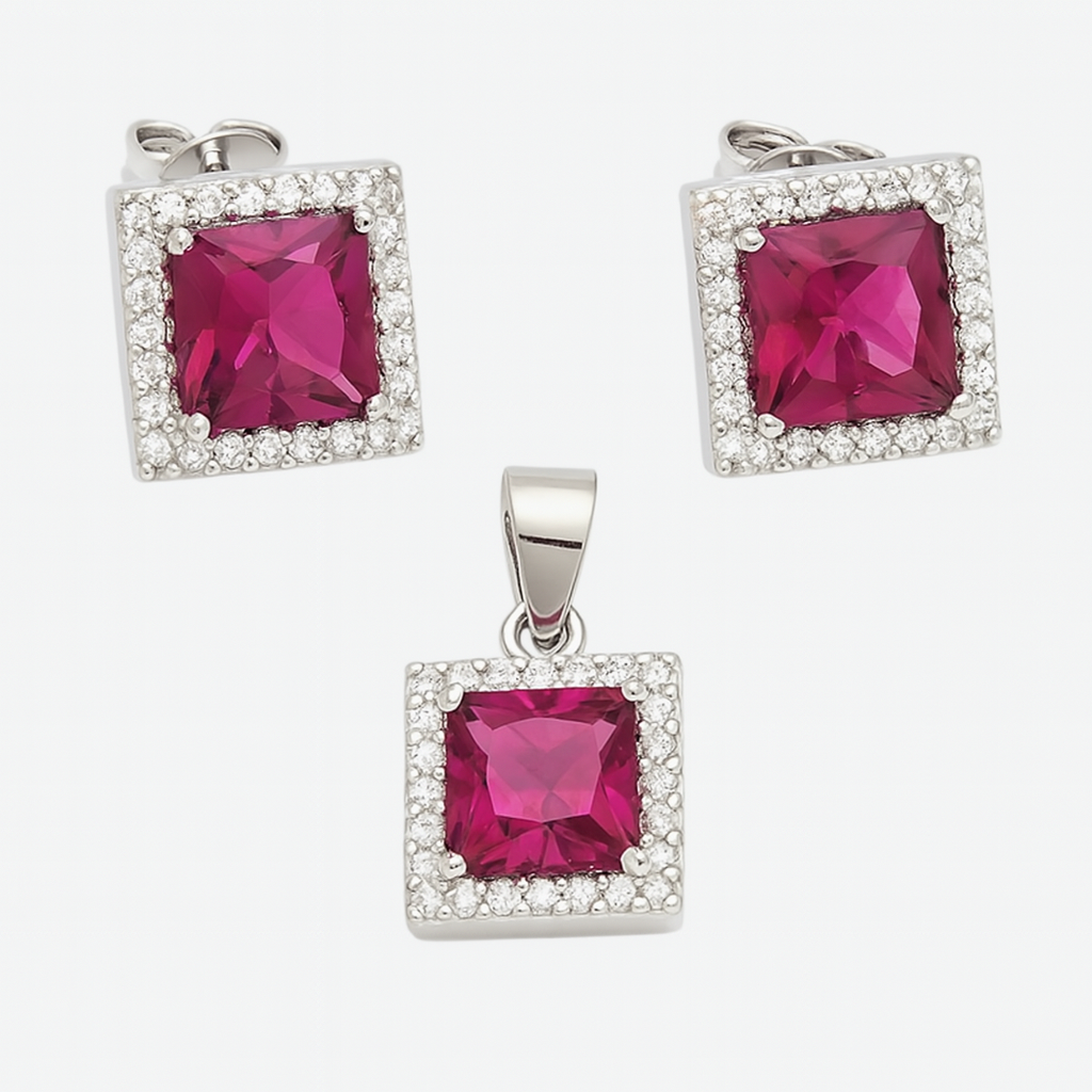The Square Rosé Elegance Set features a matching pendant and stud earrings, each showcasing a radiant dark rose princess-cut stone framed by a halo of sparkling cubic zirconia. Set in polished silver, this square-cut design balances bold color with timeless brilliance, making it perfect for elevating both everyday style and special occasion looks.