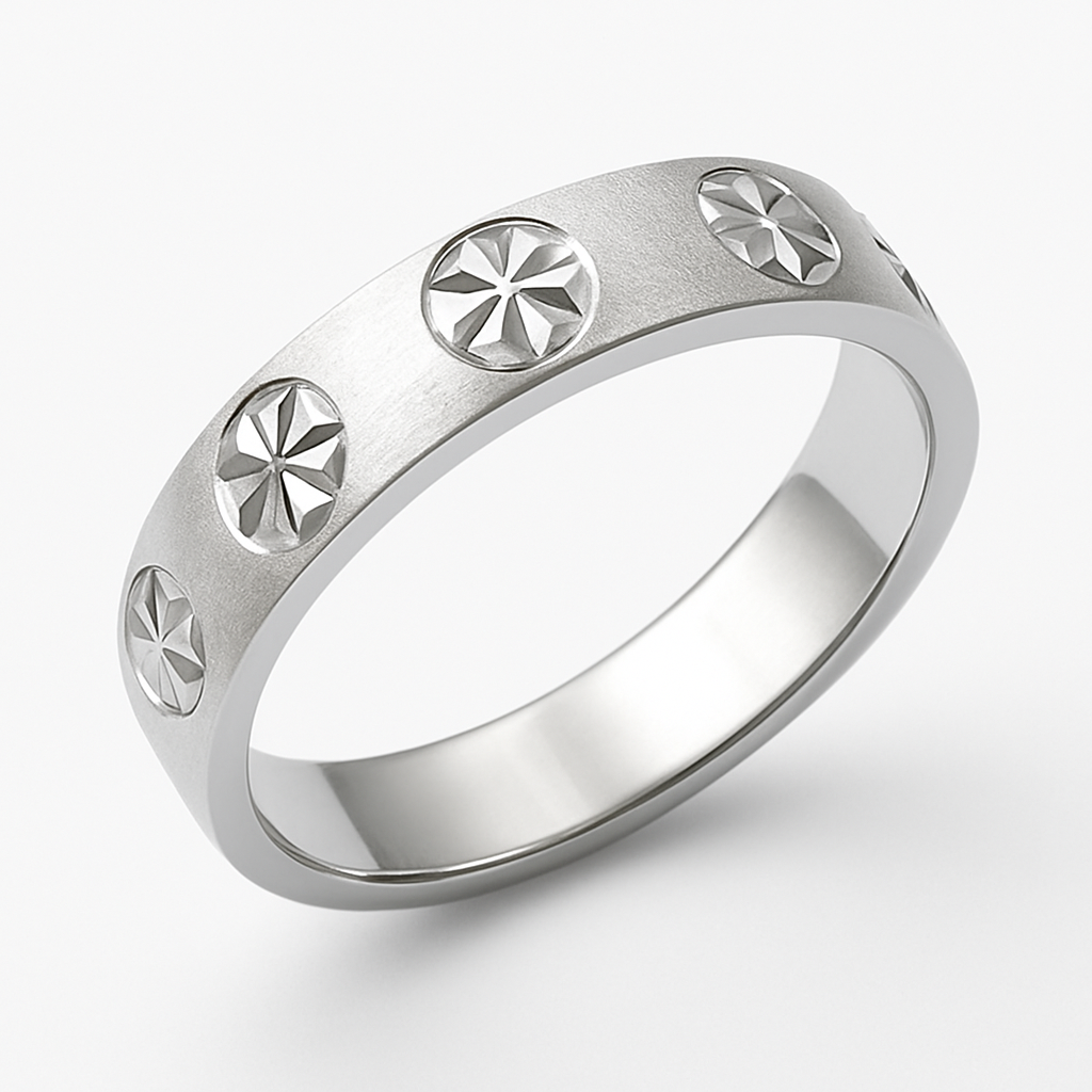 A sleek and elegant sterling silver ring featuring a series of precisely carved star motifs encircling the band. The polished surface and repeating pattern give this piece a refined, celestial appeal, making it ideal for everyday wear or as a meaningful gift. Its timeless design blends traditional charm with subtle modern flair.