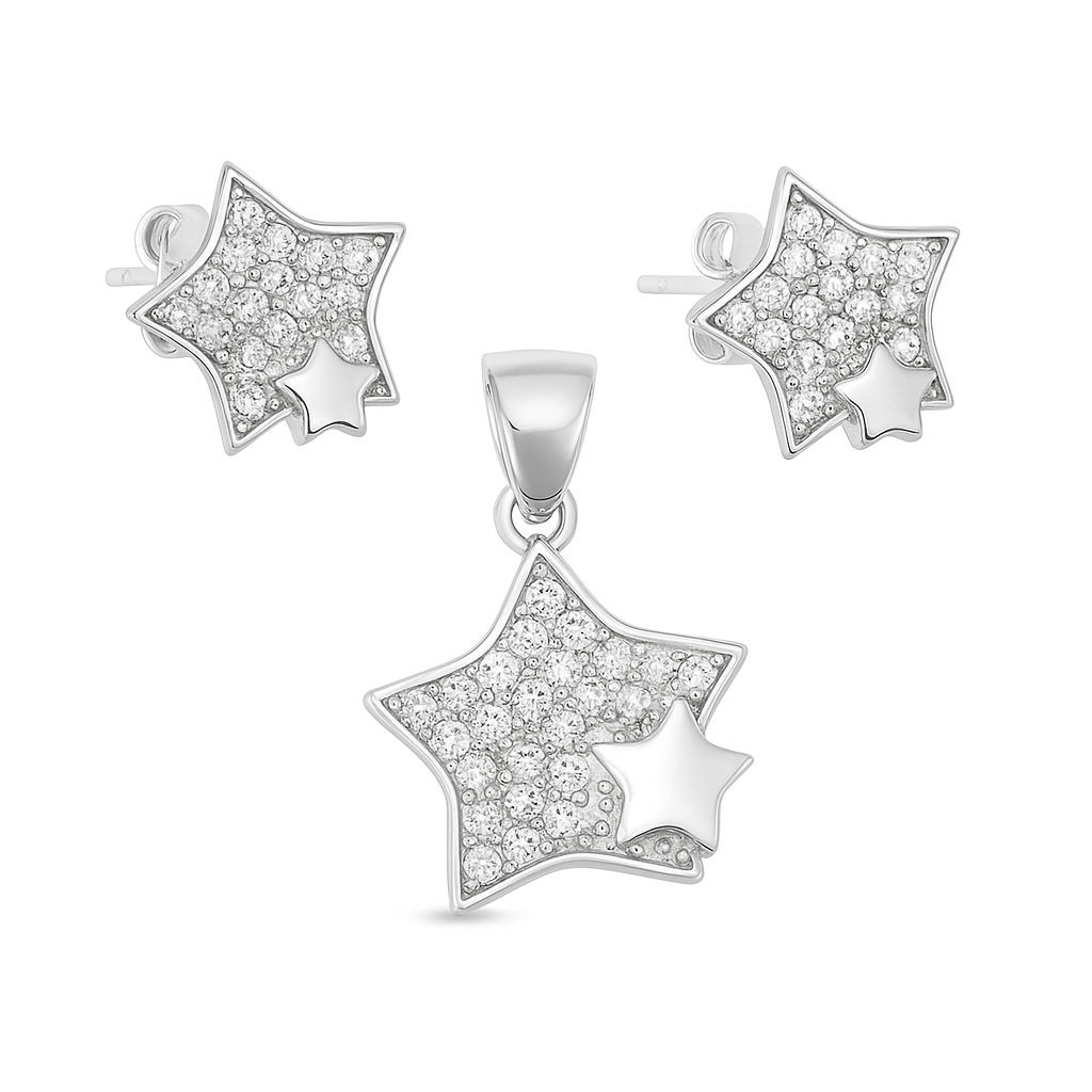 Shine with subtle brilliance in the Stellar Spark Set, featuring a graceful star-shaped pendant and matching stud earrings. Each piece is crafted from polished sterling silver and encrusted with dazzling cubic zirconia, creating a soft, celestial shimmer. A smaller accent star adds dimension and charm, perfect for anyone who loves timeless designs with a hint of cosmic beauty. Ideal for gifting or elevating your everyday style.