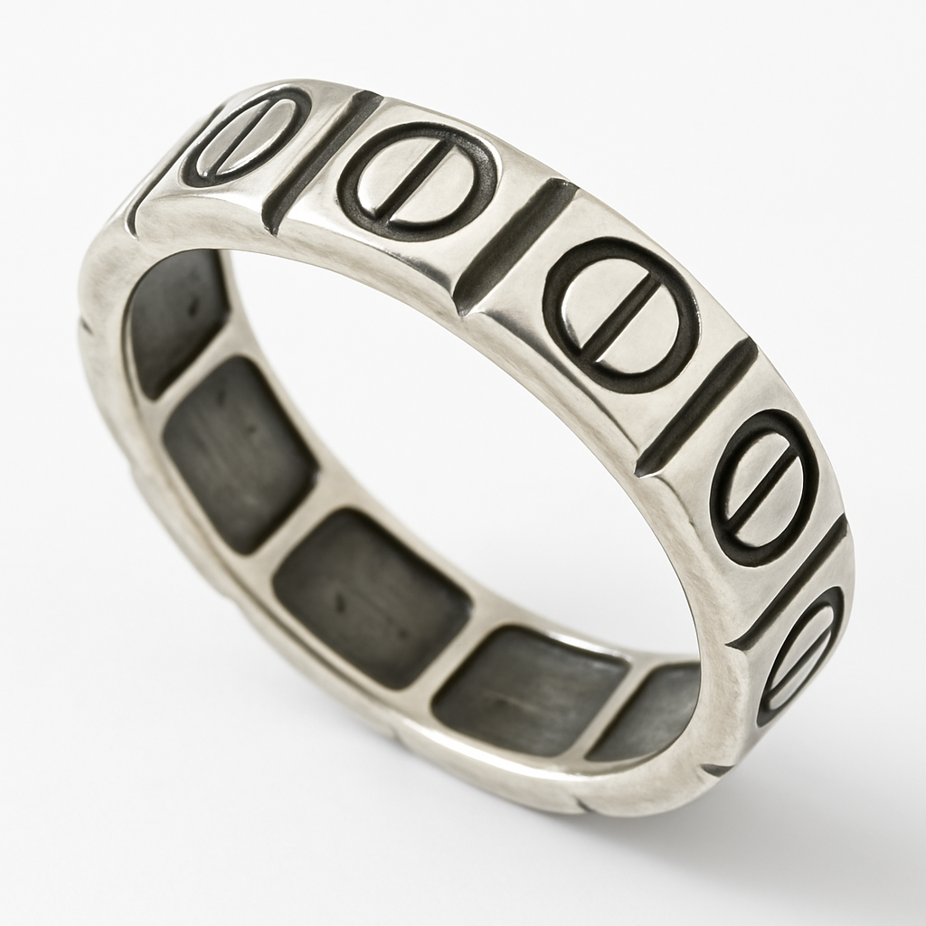 The Symbolic Grid Ring features a bold pattern of half-circle and vertical bar symbols enclosed in rectangular segments, giving it a distinct and modern industrial feel. Crafted in sterling silver with a slightly oxidized finish, the raised elements contrast subtly with the darkened background for a look that’s both structured and expressive. Ideal for those who appreciate clean lines, symmetry, and symbolic design.