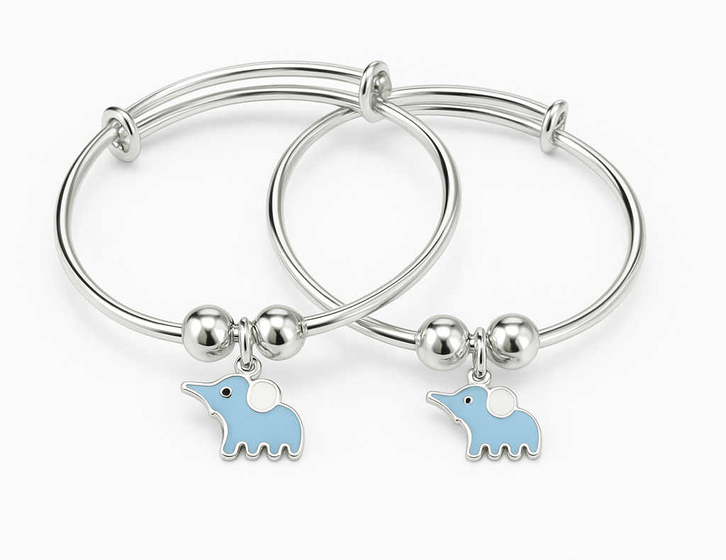 These delicate silver baby kangans feature a pair of polished circular bangles adorned with adorable baby blue elephant charms. The smooth, minimalistic design with two round silver beads adds a playful and heartwarming touch, perfect for your little one’s special moments. Lightweight and charming, these kangans blend comfort with cute elegance.