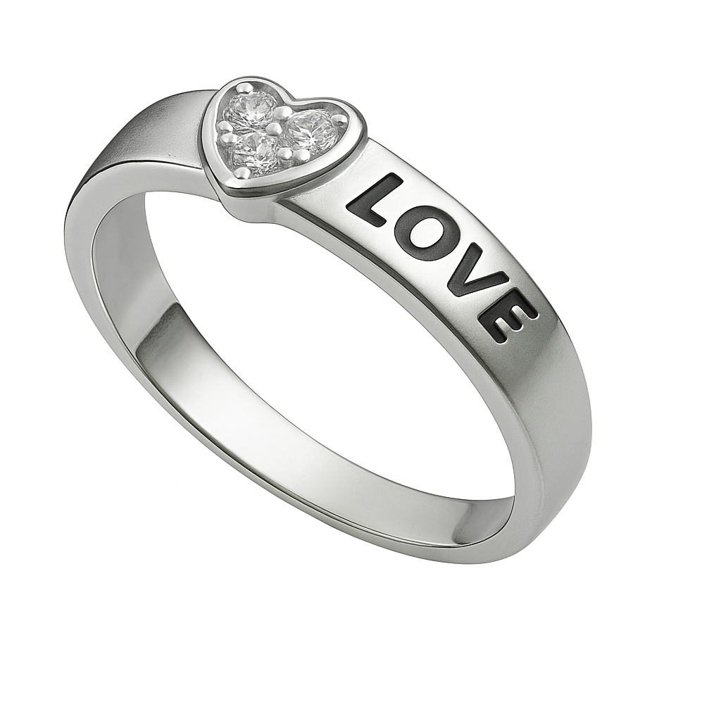 The True Mark ring blends simplicity with sentiment, featuring the word “LOVE” engraved beside a heart-shaped stone cluster. Crafted in polished silver, this ring is a modern symbol of affection — perfect for meaningful gifting or daily wear with a romantic touch.