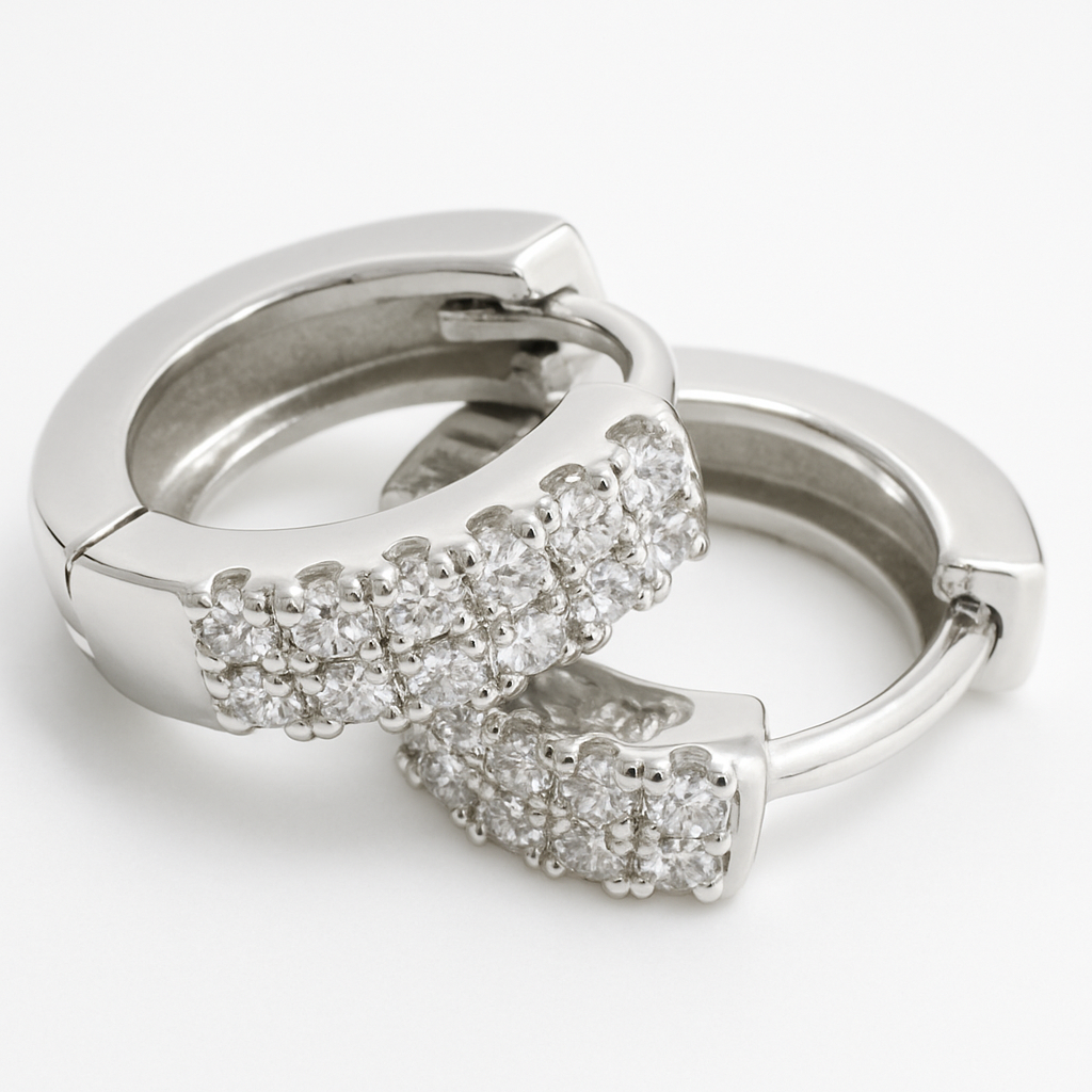 Crafted in polished sterling silver, the Twin Line Bali exude timeless elegance with a modern edge. Their compact huggie silhouette is encrusted with twin rows of brilliant cubic zirconia, offering a radiant sparkle from every angle. Perfect for both everyday wear and special occasions, these hoops hug the ear comfortably while adding just the right amount of shine.