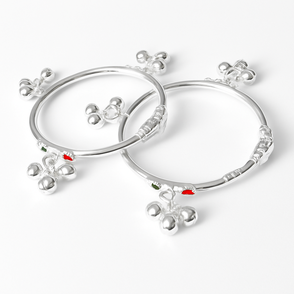 Crafted from pure silver, these traditional baby kangans feature a delicate coil design adorned with gentle tinkle bells. Their smooth, rounded structure ensures comfort for tiny wrists, while the intricate detailing adds a timeless charm. Perfect for gifting or everyday wear, these kangans are a beautiful blend of heritage and love. Hypoallergenic and baby-safe.