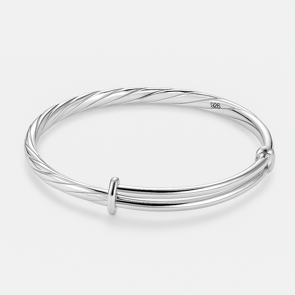 A sleek and timeless silver bangle featuring a gentle twisted design, this bracelet showcases a perfect balance of modern elegance and traditional craftsmanship. Made from high-quality sterling silver, its smooth finish and subtle spiral detailing make it ideal for everyday wear or special occasions. A versatile piece that adds effortless sophistication to any outfit.