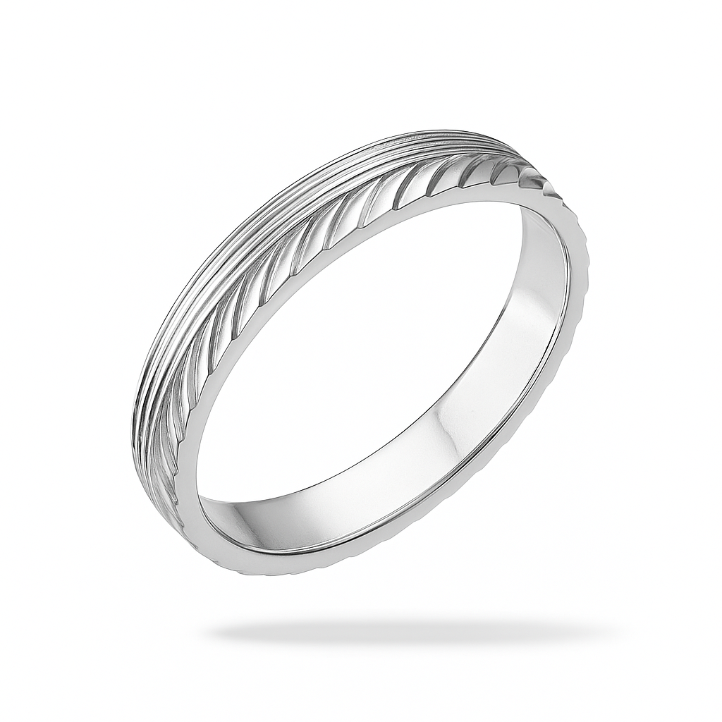 This elegant silver ring features a refined diagonal twist pattern across its surface, capturing light from every angle. The sleek design gives it a timeless charm, perfect for daily elegance or subtle sophistication on special occasions. The polished finish and clean lines make it a versatile unisex piece that complements both classic and modern styles.