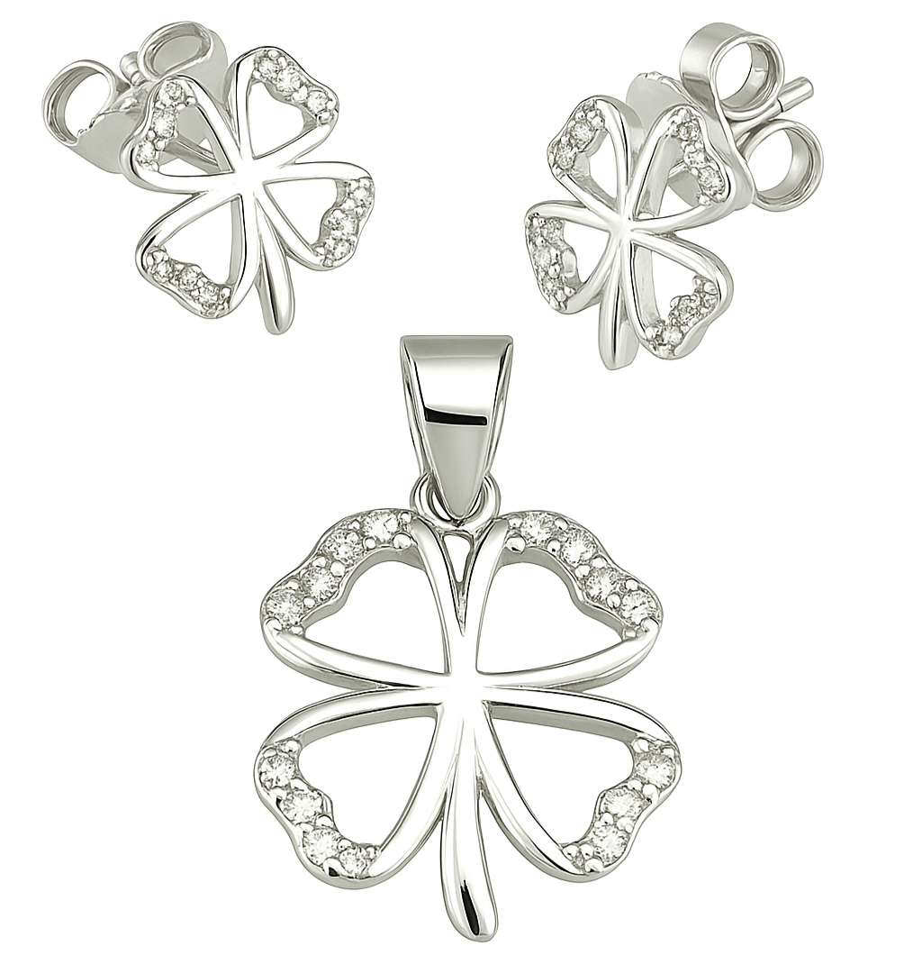Embrace charm and sparkle with the Whispering Flower. This graceful jewelry set features a beautifully polished four-leaf clover pendant and matching stud earrings, each accented with shimmering cubic zirconia along the petal edges. Symbolizing luck and positivity, this sterling silver set adds a touch of elegance to any look—perfect for both everyday wear and special moments.